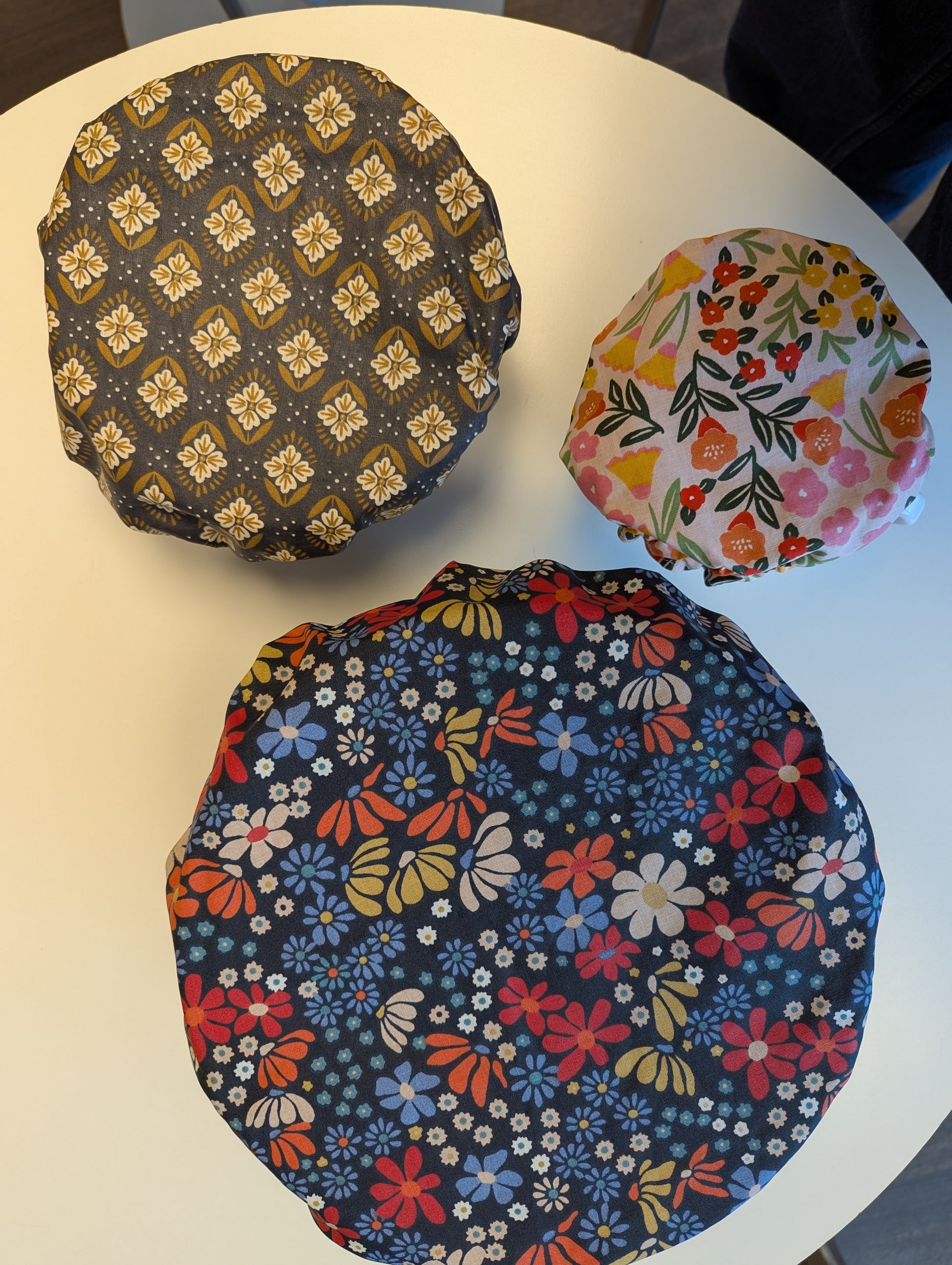 Jedes Set enthält drei Hauben in drei Grössen mit verschiedenen Drucken. Auf der einen Seite sind es Uni-Farben, auf der anderen Seite verschiedene Muster.